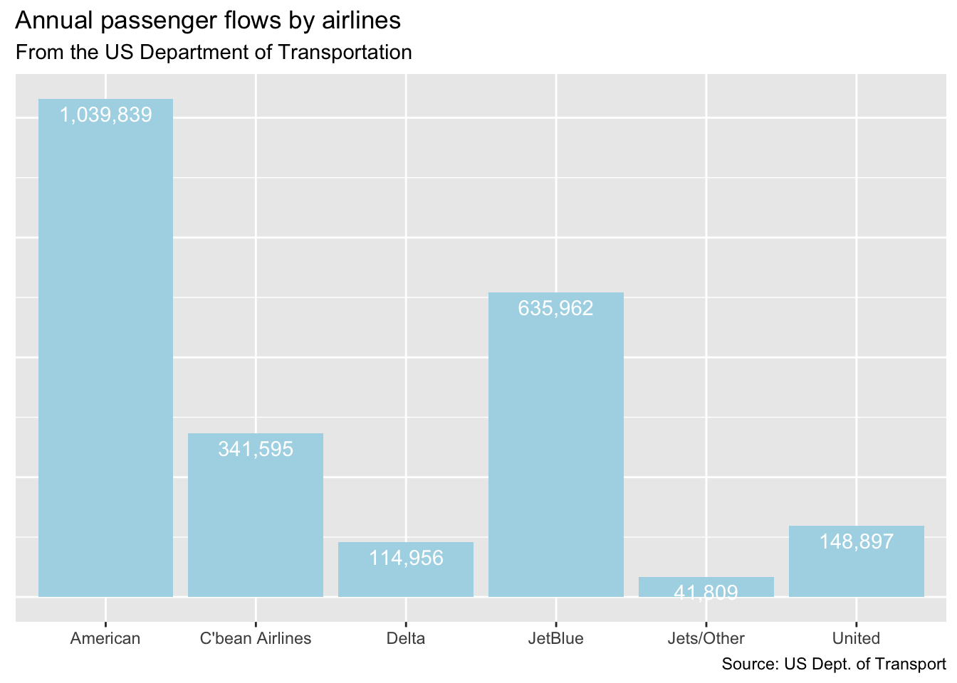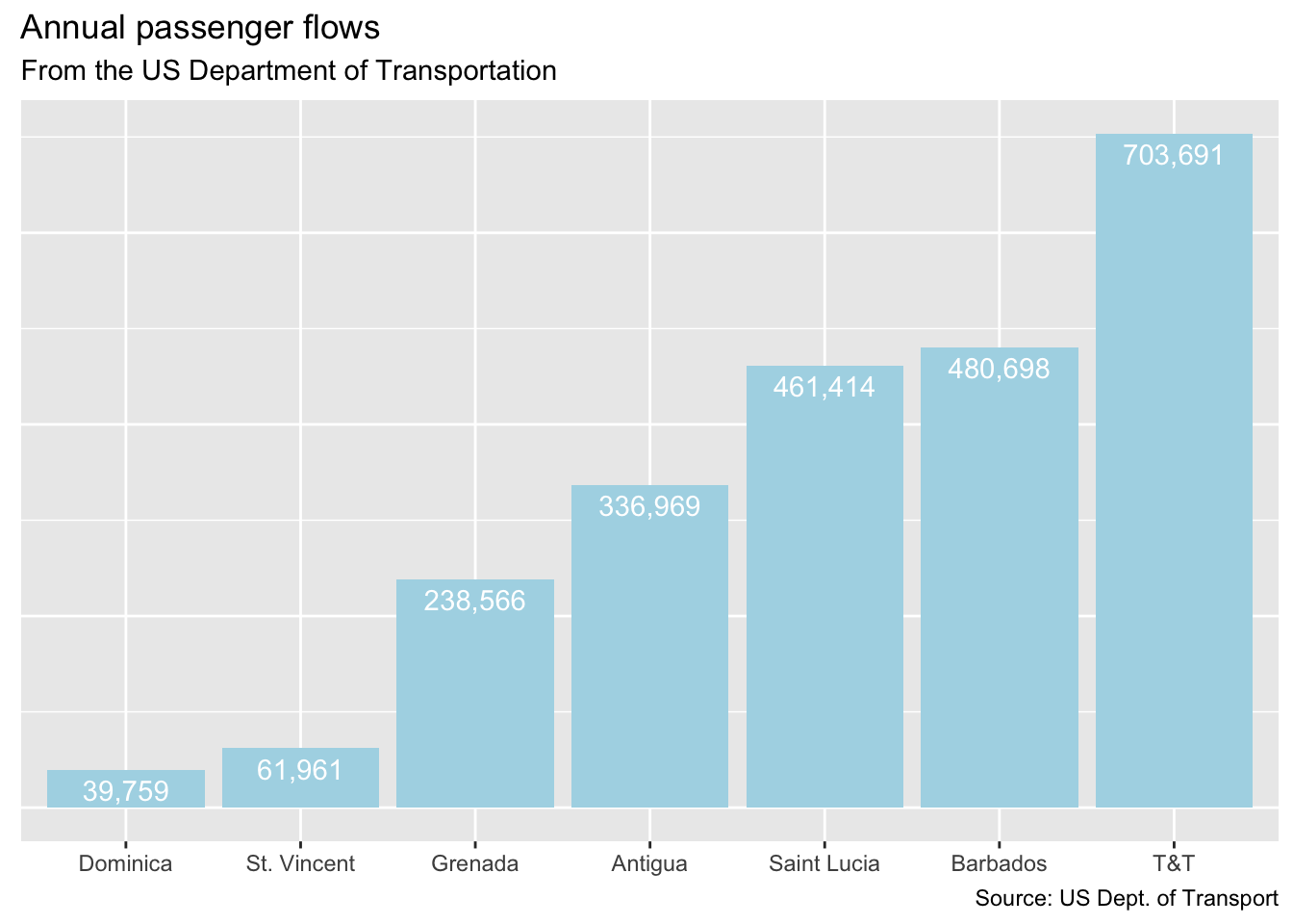 Now that we have our dataset lets work on building out a few tables and charts. The first chart we will build is one showing passenger flows to select Caribbean islands see Figure 1.