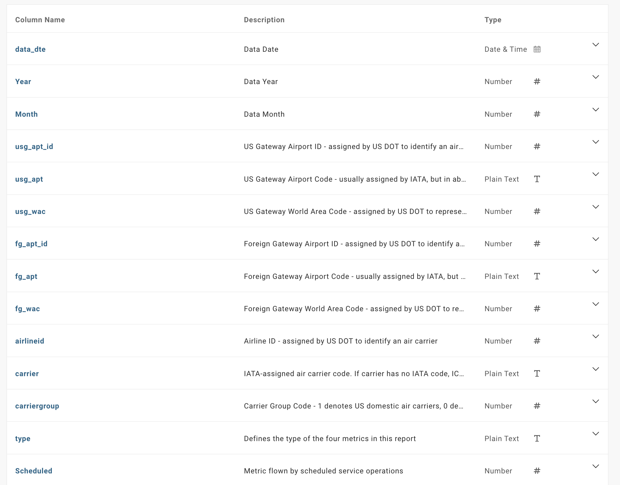 Thankfully the US Bureau of Transportation provides a description of the data and we recognize that passenger flows (Scheduled, Charter, Total) are recorded for source airport (usg_apt) and destination airport (fg_apt) in addition to by date (data_dte) and carrier. Despite this clarification the obvious shortcoming of the information provided is that fields such as destination country, full airport names, US State and city of originating flight is not provided.