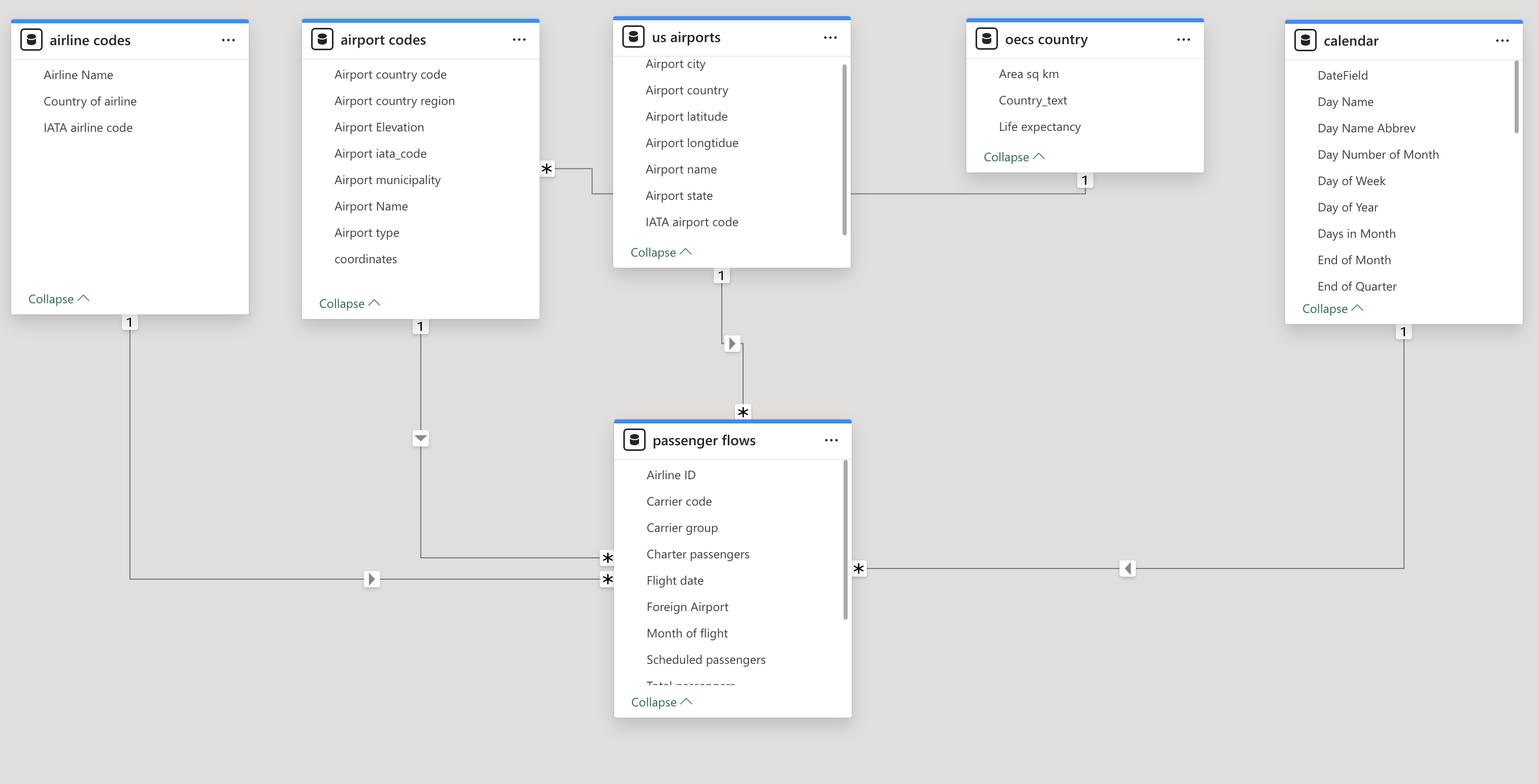 In this data model we have connected (see the lines with arrows) five dimension tables to our fact table “passenger flows”. The connections made are: